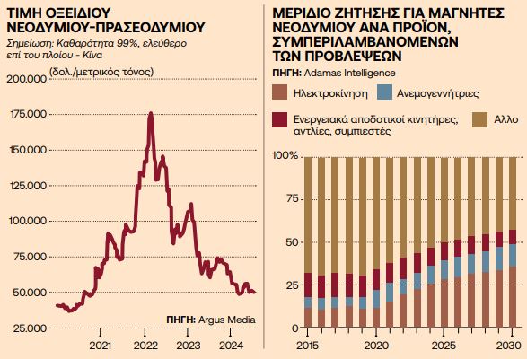 Ωστόσο, παρά την εκτίμηση για αύξηση της ζήτησης λόγω της ενεργειακής μετάβασης, οι τιμές των σπάνιων γαιών είναι σε καθοδική πορεία από τις αρχές του 2022.