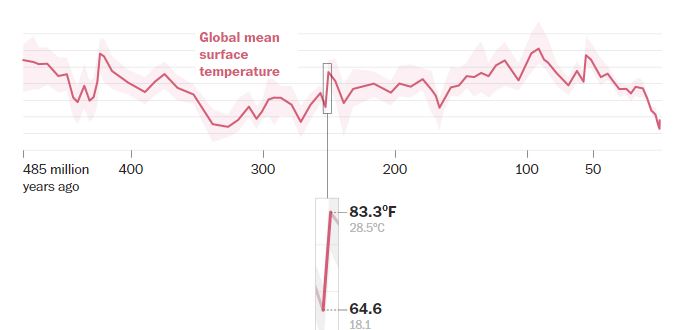 Το χρονοδιάγραμμα δείχνει πώς οι γρήγορες και δραματικές αλλαγές της θερμοκρασίας συνδέθηκαν με πολλές από τις χειρότερες στιγμές του κόσμου – συμπεριλαμβανομένης της μαζικής εξαφάνισης περίπου του 90% όλων των ειδών και του αστεροειδούς που σκότωσε τους δεινόσαυρους.