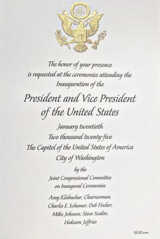 «Η τιμή της παρουσίας σας ζητείται για την τελετή της Ορκωμοσίας του Προέδρου και Αντιπροέδρου των Ηνωμένων Πολιτειών της Αμερικής, στις 20 Ιανουαρίου 2025, στο Καπιτώλιο των Ηνωμένων Πολιτειών στην πόλη της Ουάσιγκτον», αναφέρεται στην πρόσκληση.